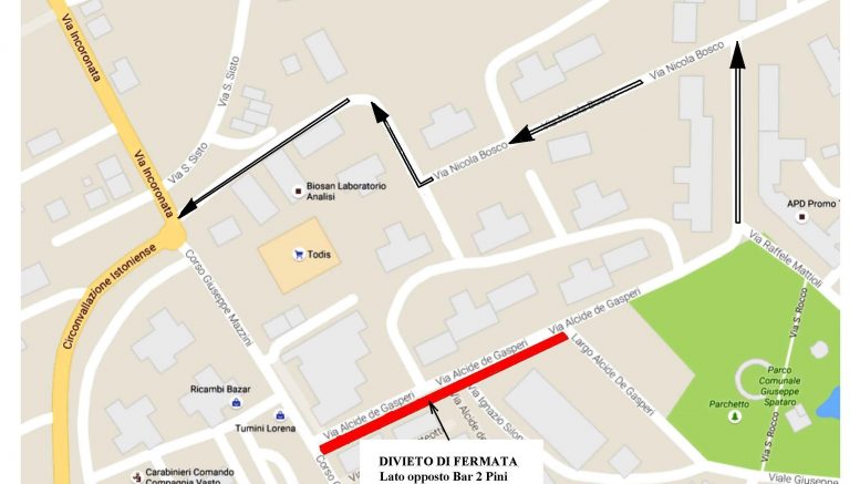 Sempre su Via De Gasperi, nei tratti compresi tra Corso Mazzini e Via Spataro e tra Via Spataro e Via Mattioli, sarà istituito, dalle ore 7:00 alle ore 9:00 e dalle ore 12:00 alle ore 14:00, il divieto di fermata ad esclusione degli autobus per il servizio extra urbano (lato opposto al “Bar 2 Pini”).