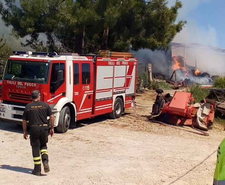 Sul posto sono prontamente intervenute tre squadre dei Vigili del Fuoco del distaccamento di Roseto e del Comando Provinciale di Teramo oltre ad una squadra della Protezione civile di Silvi. A causa dell’incendio diverse attrezzature agricole sono andate distrutte. Danni per diverse migliaia di euro. Le fiamme si sono sprigionate intorno alle ore 13 in un capannone dove erano custodite delle roto balle di fieno, ubicato nei pressi delle stalle dell’ Azienda Casearia i Calanchi di Atri. Per rifornirsi di acqua i mezzi dei Vigili del Fuoco hanno utilizzato gli idranti dell’ Ospedale di Atri. Gli uomini della Protezione Civile hanno tratto in salvo circa 80 capi di bestiame ricoverati in una stalla situata nei pressi del rogo. Le fiamme hanno rischiato di interessare una cisterna di gasolio per il rifornimento di mezzi agricoli e un serbatoio di gas Gpl nelle vicinanze. I pompieri hanno raffreddato le lamiere della cisterna di gasolio e tenuto sotto controllo le fiamme. Il rapido intervento, con l’impiego di due autopompe e due autobotti, ha impedito che l’incendio si propagasse alla vicina stalla che ospita bovini. L’azione di spegnimento ha impedito che le fiamme si estendessero ai terreni circostanti il capannone, interessando la sterpaglie. Al momento si sta procedendo allo smassamento del materiale parzialmente bruciato, anche utilizzando un mezzo meccanico messo a disposizione dall’azienda agricola