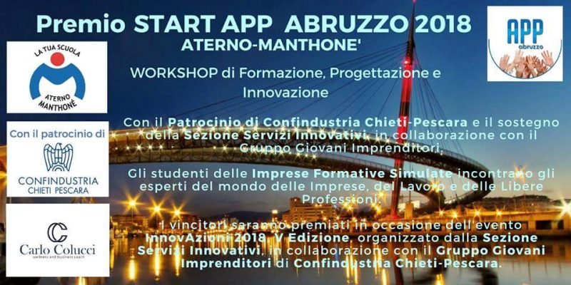 I ragazzi dell’Aterno-Manthonè, diretto dalla preside Antonella Sanvitale, hanno esposto i loro elaborati nella sede scolastica di via Tiburtina a Pescara, davanti a una platea di imprenditori, professionisti e docenti, ognuno dei quali ha assunto il ruolo di tutor progettuale. Gli studenti erano divisi in nove team, secondo quanto previsto dal workshop del premio StartAppAbruzzo 2018, patrocinato da Confindustria Chieti Pescara e dall’associazione App Abruzzo; ideatori e coordinatori Giuseppe Tolet, docente di economia aziendale e Carlo Colucci, business coach.
