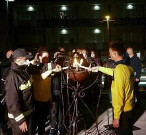 BRACIERE ACCESO DAGLI ATLETI UCRAINI – Valeria Kononenko, atleta 31enne affiancata dal 20enne Denys Khotulov, scelti tra i ciclisti della nazionale ucraina ospiti del capoluogo abruzzese da quasi un mese, hanno acceso il braciere nel Parco della Memoria, allestito in piazzale Paoli alle porte del centro in ricordo delle 309 vittime del sisma del 6 aprile 2009.Un gesto di solidarietà in omaggio a una comunità colpita dalla guerra. La delegazione degli atleti ucraini, rimasta bloccata in Turchia dopo l’inizio del conflitto, è ospite del progetto Case di Roio, uno dei quartieri antisismici costruiti proprio per ospitare le famiglie sfollate del sisma. Accanto agli atleti, una bandiera ucraina La fiaccolata, a cui hanno partecipato 2-3mila persone, ha raggiunto piazzale Paoli per dare il via alla cerimonia in ricordo del sisma, partendo proprio dall’accensione del braciere e, a seguire, la lettura di tutti i nomi delle vittime. Alle 24, nella chiesa di Santa Maria del Suffragio, in Piazza Duomo – lì dove è stato acceso un alto fascio di luce, la Messa officiata dall’arcivescovo metropolita della città dell’Aquila, cardinale Giuseppe Petrocchi, cui è seguita laa veglia di preghiera a cura dell’arcidiocesi. Alle 3:32 sono risuonati i 309 rintocchi, uno per ognuna delle vittime.