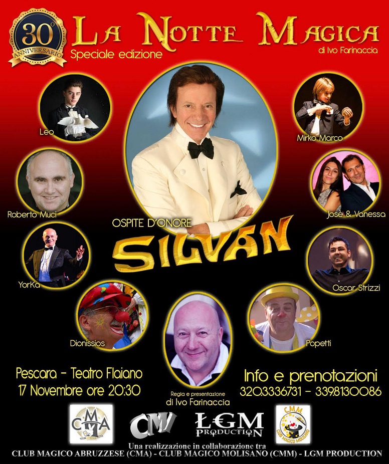 Il clou ci sarà il 17 novembre con la serata di gala che vedrà come ospite d’onore il mago Silvan con lo spettacolo “Recital”. Nei tre giorni di eventi, organizzati per il trentennale della “Notte magica”, sul palcoscenico del teatro Flaiano si esibiranno anche i maghi abruzzesi del club magico abruzzese di Ivo Farinaccia, regista e presentatore della 30^ “Notte magica”.