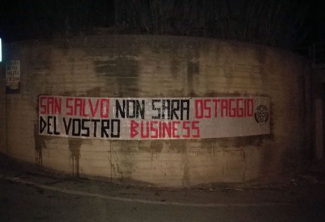 “San Salvo non sarà ostaggio del vostro business” Questo il testo dello striscione con cui CasaPound Italia è intervenuta in merito alla vicenda dell’apertura di un altro centro di accoglienza per immigrati a San Salvo, che ha suscitato aspre polemiche tra il sindaco ed il prefetto di Chieti, invitato ad illustrare il provvedimento oggi davanti al consiglio comunale.