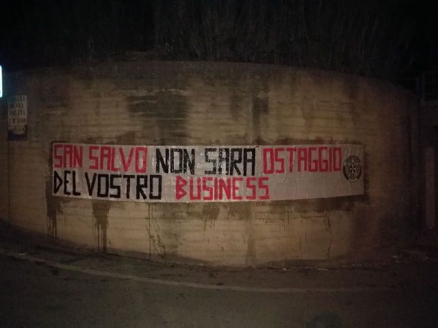 “San Salvo non sarà ostaggio del vostro business” Questo il testo dello striscione con cui CasaPound Italia è intervenuta in merito alla vicenda dell’apertura di un altro centro di accoglienza per immigrati a San Salvo, che ha suscitato aspre polemiche tra il sindaco ed il prefetto di Chieti, invitato ad illustrare il provvedimento oggi davanti al consiglio comunale.