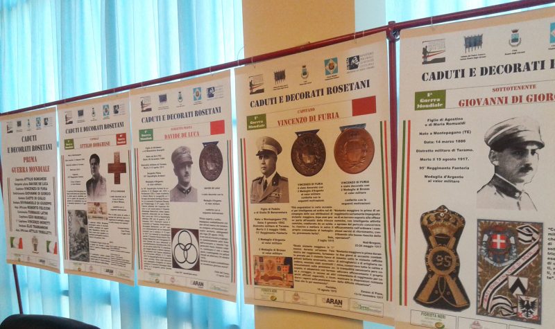 “La mostra – si legge nella nota dell’organizzazione – è stata allestita in occasione della manifestazione “Per non dimenticare 2018”, settima edizione, e delle commemorazioni dei 100 anni della prima guerra mondiale (1918-2018), eventi storici che si stanno svolgendo in tutta Italia. Gli organizzatori sono Emidio D’Ilario, presidente del Circolo Filatelico Numismatico Rosetano, e il giornalista e scrittore Luciano Di Giulio. Insieme hanno ripercorso le due guerre e contribuito alla ricerca di tanti soldati dimenticati, presentando quest’anno anche un volume che porta lo stesso nome della mostra. L’esposizione rosetana dei caduti e decorati ha ottenuto l’autorizzazione della Presidenza dei Consiglio dei Ministri ad utilizzare il logo ufficiale delle commemorazioni del centenario della prima guerra mondiale. Partner dell’iniziativa sono l’amministrazione comunale di Roseto degli Abruzzi, l’Istituto del Nastro Azzurro e l’Archivio di Stato di Teramo”.