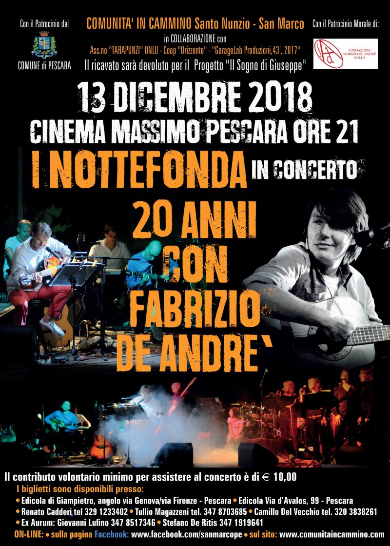 Il concerto si terrà al Teatro Massimo alle ore 21. L’evento è organizzato da Comunità in cammino, parrocchie Santo Nunzio e San Marco, in collaborazione con l’associazione Tarapunzi Onlus e con Garage Lab produzioni e cooperativa Orizzonte, ed è patrocinato da Assessorato alla Cultura e Comune di Pescara; Fondazione Fabrizio De André Onlus. Anche in questa occasione, come in molte altre precedenti, i Nottefonda metteranno il loro concerto al servizio di una buona causa: il ricavato della serata sarà interamente devoluto al progetto Il sogno di Giuseppe, ideato e guidato dal sacerdote Giorgio Moriconi e da un gruppo di volontari e promosso dalle Parrocchie Santo Nunzio Sulprizio e San Marco Evangelista. La band dei Nottefonda è composta da 13 elementi, di cui 9 strumentisti e 4 coriste. La formazione, nata nel 1998, ha tenuto concerti in varie regioni italiane, dal Molise alla Puglia, dalla Lombardia all’Abruzzo. Caratteristica del gruppo è l’uso di strumenti etnici come il bouzuki, il liuto arabo, il mandolino e il berimbao.