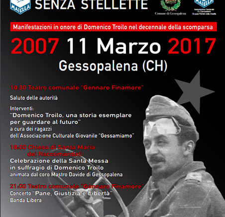Domenico Troilo, l’ultimo soldato senza stellette. Aveva 20 anni Domenico Troilo quando gli misero addosso la divisa militare e lo mandarono in Africa settentrionale. Ne aveva appena 21 quando, rientrato fortunosamente a Gessopalena dopo l’8 settembre del 1943, si trovò a comandare un pugno di uomini decisi a tutto pur di difendere la loro terra e le loro vite dall’occupante tedesco. A 10 anni dalla scomparsa di Domenico Troilo si susseguono le iniziative per ricordare la sua figura.