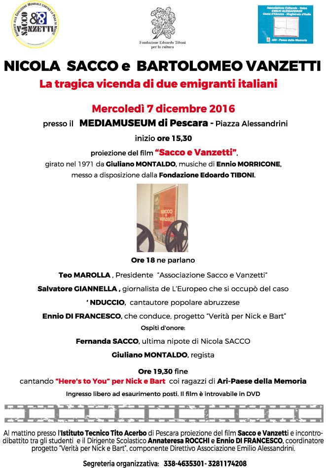 Nel corso dell’incontro sarà proiettato il film “Sacco e Vanzetti” girato nel 1971 da Giuliano Montanldo con la colonna sonora del maestro Ennio Morricone. Pellicola messa a disposizione dalla Fondazione Edoardo Tiboni. Subito dopo la proiezione del film l’intervento di alcuni autorevoli ospiti tra i quali citiamo, Teo Marolla, Presidente dell’Associazione Sacco e Vanzetti, Ennio Di Francesco, già ufficiale dei Carabinieri e funzionario di pubblica sicurezza. Promotore negli anni ’70 del “Movimento per la democratizzazione e riforma della Polizia”. Autore dei libri “Un Commissario” e “Frammenti di Utopia”. Presidente dell’Associazione “Emilio Alessandrini” . Membro del “Comitato nazionale sport contro droga” e curatore del progetto “Verità per Nick e Bart”. Inoltre l’intervento del giornalista Salvatore Giannella. Ospiti d’Onore Fernanda Sacco, ultima nipote di Nicola Sacco ed il regista del film, Giuliano Montaldo.