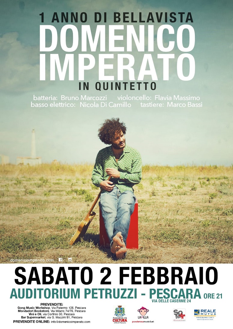 “Bellavista” compie un anno. La seconda raccolta musicale del cantautore Domenico Imperato festeggia il suo primo compleanno con un concerto che si terrà domani alle ore 21 all’auditorium Petruzzi di Pescara, con la cosiddetta “Band delle cinque province”: Domenico Imperato (chitarre e voce), Flavia Massimo (violoncello), Bruno Marcozzi (batteria), Nicola Di Camillo (basso elettrico) e Marco Bassi (tastiere).