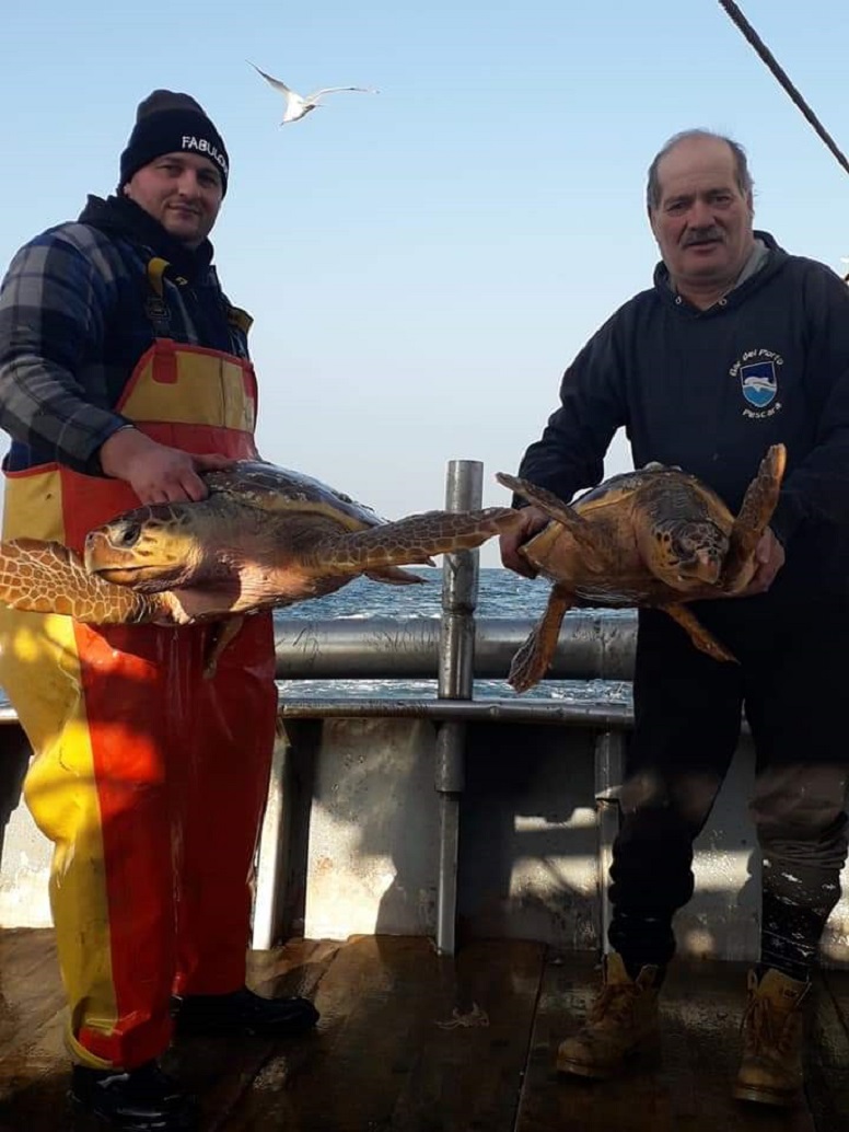 Le prime a essere salvate in mare nelle giornata di ieri, martedì 19 febbraio 2019, sono state Gioia e Aurora, due tartarughe della specie Caretta caretta, catturate accidentalmente a poche miglia da Francavilla al Mare dal motopeschereccio Nuova Zita di Mario Camplone, che per i due esemplari di tartarughe ha scelto i nomi delle nipotine. Custodite e accudite dall’equipaggio del motopeschereccio fino al rientro in porto, Gioia e Aurora sono state consegnate ai volontari del Crtm, il centro per il recupero delle tartarughe marine, che le attendevano in banchina. Aurora, di 35 kg per 70 cm di lunghezza, e Gioia, di 21 kg e 57 cm, sono ora affidate all’equipe dei veterinari e biologi del Centro studi cetacei, che se ne sta prendendo cura presso il Crtm.