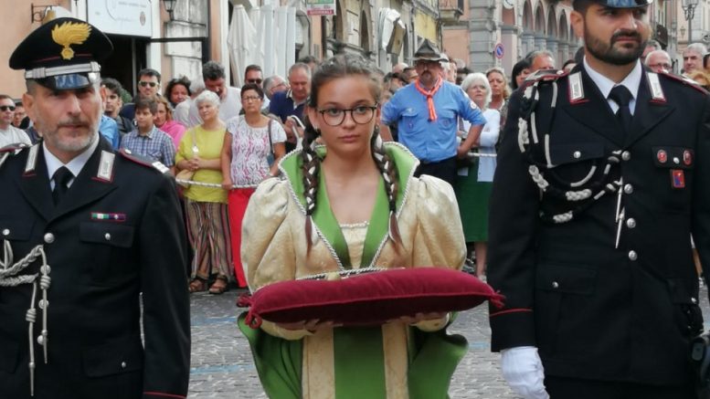 Hanno preso parte al corteo il Gruppo Storico de Lo Certame di Popoli e il Gruppo Storico della Città di Atri-Claricantus. Tra i gonfaloni che hanno sfilato, con i relativi rappresentanti istituzionali, quelli della: Regione Abruzzo e della Provincia di Teramo. Presenti anche i gonfaloni di molti comuni come: Teramo, Giulianova, Silvi, Pineto, Campli, Isola del Gran Sasso d’Italia, Morro D’Oro, Bisenti, Montefino, Arsita, Castel Castagna, Penna Sant’Andrea, Colledara e Atri. Hanno preso parte al corteo anche il Vicario del Prefetto di Teramo Edoardo D’Alascio, referenti della Guardia di Finanza, dei Carabinieri della Stazione di Atri, del Commissariato di Polizia di Atri, della Proloco Hatria, della Croce Rossa e della Protezione Civile. A chiudere il corteo è stata la dama con il Battocchio (ovvero il martelletto), quest’anno ha ricoperto questo ruolo è Chiara Di Benedetto del Gruppo Scout di Atri. L’iniziativa è stata organizzata dal Comune di Atri, dalla Basilica Concattedrale Santa Maria Assunta e dalla Pro Loco Hatria in collaborazione con le forze dell’ordine, il gruppo scout Atri 1, la Protezione Civile gruppo alpini Atri, la CRI gruppo di Atri, il coro G. D’Onofrio. I tedofori che hanno portato la fiaccola da L’Aquila ad Atri fanno parte delle associazioni sportive: ASD HAT Atri Polisportiva, ASD Podistica dell’Adriatico – Scerne, Podistica New Castle – Castelnuovo al Vomano.