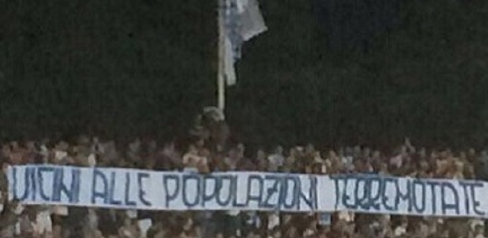 “Vicini alle popolazioni terremotate, rialziamoci insieme… Pescara è con voi”. E’ lo striscione esibito ieri all’Adriatico, dai tifosi biancazzurri durante la partita con l’Inter.