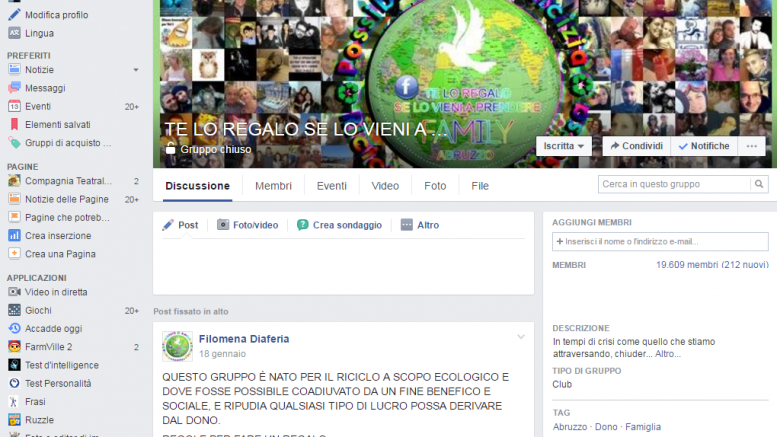 “Te Lo Regalo Se Lo Vieni a Prendere Family Abruzzo” è un gruppo che conta 20 mila iscritti su Facebook e si propone di aiutarsi vicendevolmente non solo con doni ma anche con amicizia.