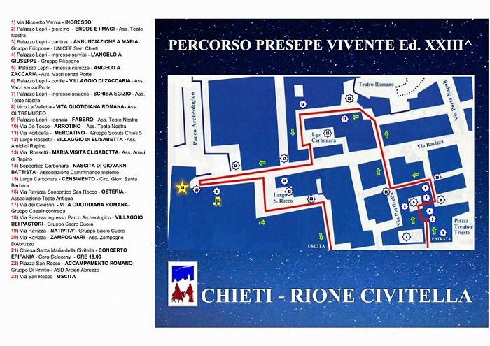 L’iniziativa vede la collaborazione con il Comune di Chieti e la Curia Arcivescovile Chieti-Vasto. La 23 esima edizione del suggestivo Presepe si svolgerà, dalle ore 16.00 alle ore 20.30, nel quartiere in cui si concentrano quasi tutte le testimonianze romane più significative dell’Antica Teate, i resti del Teatro, le Cisterne (Via Sellecchy e Larghetto Del Ponte) e l’Anfiteatro: il Rione Civitella che conserva quasi intatto l’assetto urbanistico romano. Il Presepe Vivente inizierà da Palazzo Lepri posto a ridosso della Chiesa della SS. Trinità. Si proseguirà lungo le vie del quartiere che nel medioevo era denominato “Rione Fiera” o “de Noculis” (di un occhio).