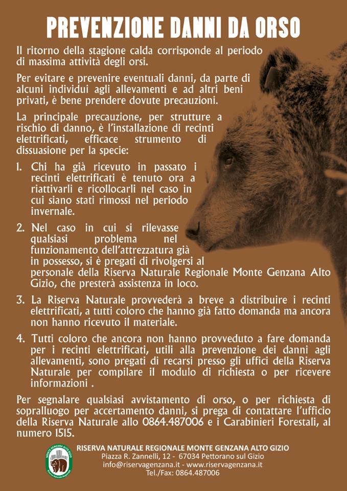 “Ricordiamo ai possessori di recinzioni elettrificate – scrivono (guarda sotto) dalla Riserva – di riattivarle nel più breve tempo possibile e di voler verificare il loro corretto funzionamento. Avvisiamo chiunque non ne fosse in possesso che per il nostro territorio comunale è possibile farne richiesta gratuitamente per la messa in sicurezza degli animali da cortile. In caso di qualsiasi evenienza, potete contattare la Riserva Monte Genzana al numero 0864.487006 – [email protected], il cui personale è vostra a disposizione”.