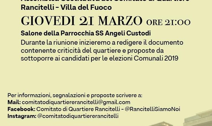 Giovedì 21 marzo, alle ore 21, nel salone della parrocchia dei Santissimi Angeli Custodi è stata convocata la riunione dei residenti con oggetto l’assemblea costitutiva del comitato di quartiere Rancitelli-Villa del fuoco.