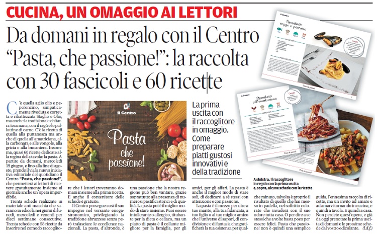 Da domani, mercoledì 19 giugno, in regalo con il quotidiano Il Centro “Pasta, che passione!”: la raccolta con 30 fascicoli e 60 ricette.