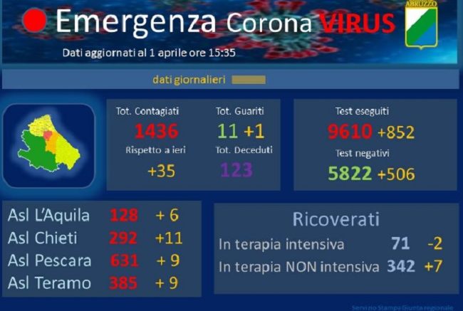 In Abruzzo, dall’inizio dell’emergenza, sono stati registrati 1436 casi positivi al Covid 19, diagnosticati dai test eseguiti nel laboratorio di riferimento regionale di Pescara, anche attraverso l’Istituto Zooprofilattico di Teramo. Rispetto a ieri si registra un aumento di 35 nuovi casi.
