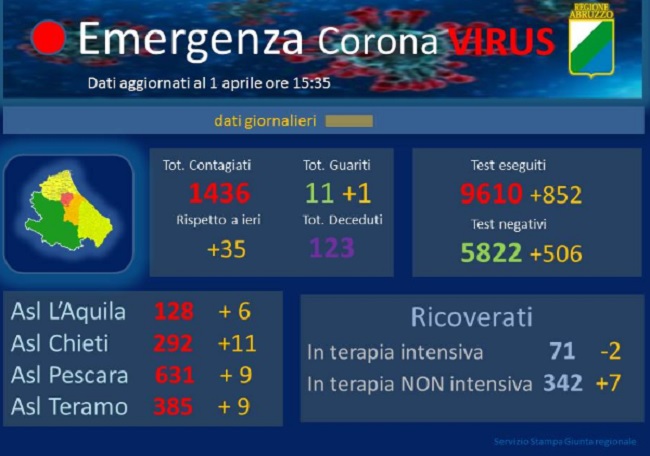 In Abruzzo, dall’inizio dell’emergenza, sono stati registrati 1436 casi positivi al Covid 19, diagnosticati dai test eseguiti nel laboratorio di riferimento regionale di Pescara, anche attraverso l’Istituto Zooprofilattico di Teramo. Rispetto a ieri si registra un aumento di 35 nuovi casi.