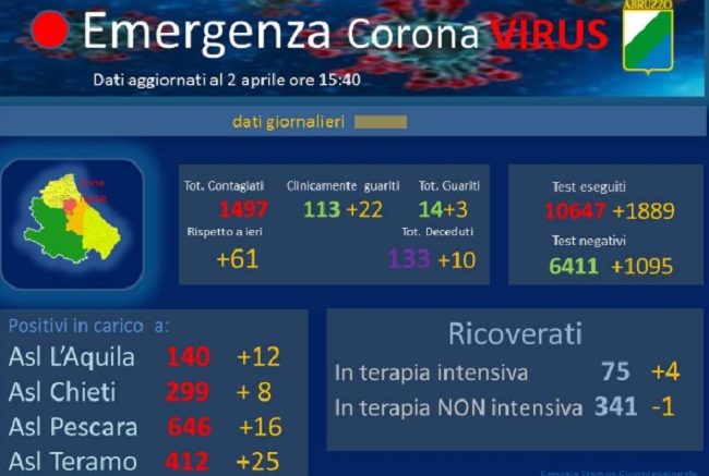 In Abruzzo, dall’inizio dell’emergenza, sono stati registrati 1.497 casi positivi al Covid 19, diagnosticati dai test eseguiti nel laboratorio di riferimento regionale di Pescara, anche attraverso l’Istituto Zooprofilattico di Teramo. Rispetto a ieri si registra un aumento di 61 nuovi casi.