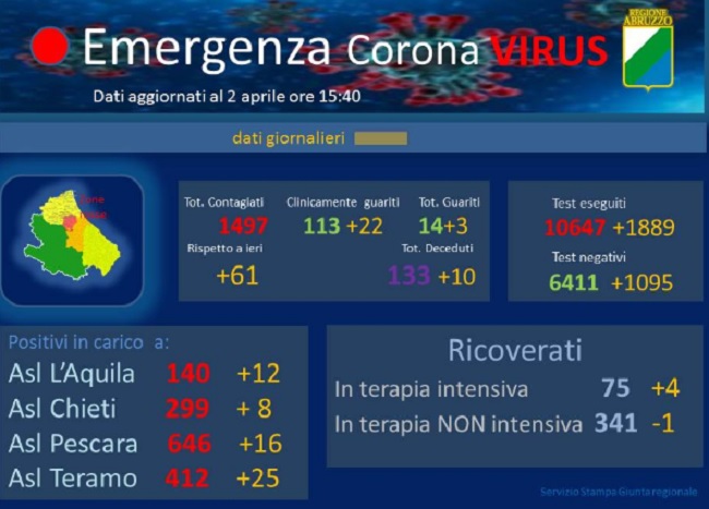 In Abruzzo, dall’inizio dell’emergenza, sono stati registrati 1.497 casi positivi al Covid 19, diagnosticati dai test eseguiti nel laboratorio di riferimento regionale di Pescara, anche attraverso l’Istituto Zooprofilattico di Teramo. Rispetto a ieri si registra un aumento di 61 nuovi casi.