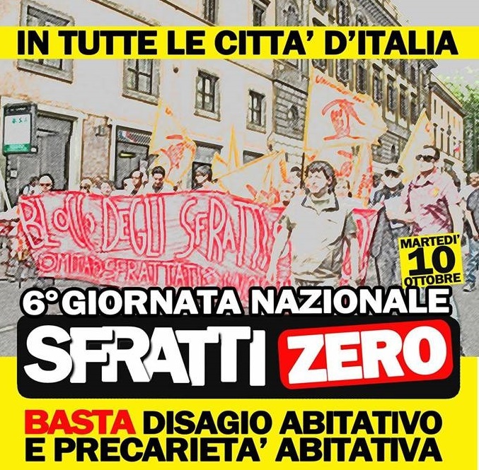 La Giornata Sfratti Zero, promossa da 15 anni dall’Alleanza Internazionale degli Abitanti, in Italia è arrivata alla VI edizione. L’obiettivo degli organizzatori è promuovere un’azione coordinata volta a sensibilizzare l’opinione pubblica sulla questione sfratti e più in generale sulla precarietà abitativa, ma anche a denunciare che il problema non viene considerato prioritario da Governo, Regioni e Comuni.