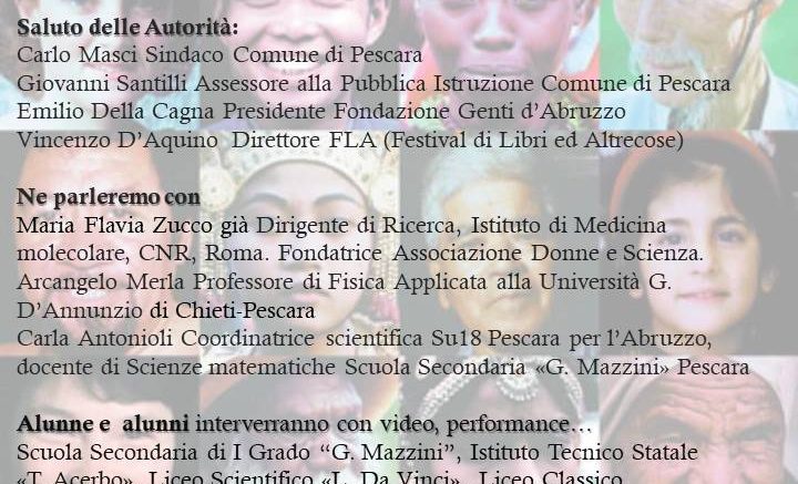 “Il nostro intento è trasformare i banchi di scuola in laboratori in cui crescere e diventare tutor di pratiche sensate da trasmettere agli adulti. Avremo anche quest’anno la collaborazione del Museo delle Genti d’Abruzzo, con il patrocinio del Comune di Pescara. Nostra illustre ospite sarà la dottoressa Maria Flavia Zucco, che ha partecipato alla stesura del Manifesto di San Rossore del 2008 e è stata Dirigente di Ricerca presso l’Istituto di Neurobiologia e Medicina Molecolare del CNR di Roma. La Zucco è anche una delle fondatrici dell’associazione Donne e Scienza, di cui è stata presidente per tanti anni. E’ stata coordinatrice del Progetto europeo Anim.AL.See (5PQ) concernente gli aspetti bioetici della sperimentazione animale. È stata anche nel direttivo dell’EPWS (European Platform for Women in Science) ed è tuttora attiva in diversi progetti europei per la promozione delle pari opportunità nella scienza. In occasione dell’incontro al Museo, gli studenti invitati a partecipare potranno rivolgere domande ai relatori, ma diventeranno anche protagonisti con i loro interventi. Le sollecitazioni dei ragazzi si inseriscono in un percorso pluridisciplinare avviato nelle scuole (tavolo della didattica) e che durante l’evento verrà esposto al tavolo della comunicazione. Riteniamo che di razzismo non si possa parlare in modo estemporaneo, avulso dai percorsi didattici, e soltanto per condannarlo a priori: la riflessione deve essere parte integrante della vita quotidiana. A scuola bisogna discuterne in maniera interdisciplinare. Oggi più che mai vogliamo essere promotori di una campagna di sensibilizzazione contro ogni forma di discriminazione razziale. Coltivare la memoria è ancora oggi un vaccino prezioso contro l’indifferenza e ci aiuta, in un mondo così pieno di ingiustizie e di sofferenze, a ricordare che ciascuno di noi ha una coscienza e la può usare, come dice Liliana Segre”.