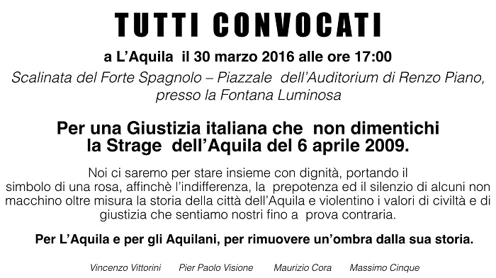 “Per una Giustizia italiana che non dimentichi la strage dell’Aquila del 6 aprile 2009. Noi ci saremo – affermano a gran voce Vincenzo Vittorini, Pier Paolo Visione, Maurizio Cora, Massimo Cinque – per stare insieme con dignità, portando il simbolo di una rosa, affinché l’indifferenza, la prepotenza ed il silenzio di alcuni non macchino oltre misura la storia della città dell’Aquila e violentino i valori di civiltà e di giustizia che sentiamo nostri fino a prova contraria. Per L’Aquila e per gli Aquilani – concludono gli organizzatori – per rimuovere un’ombra dalla sua storia.”