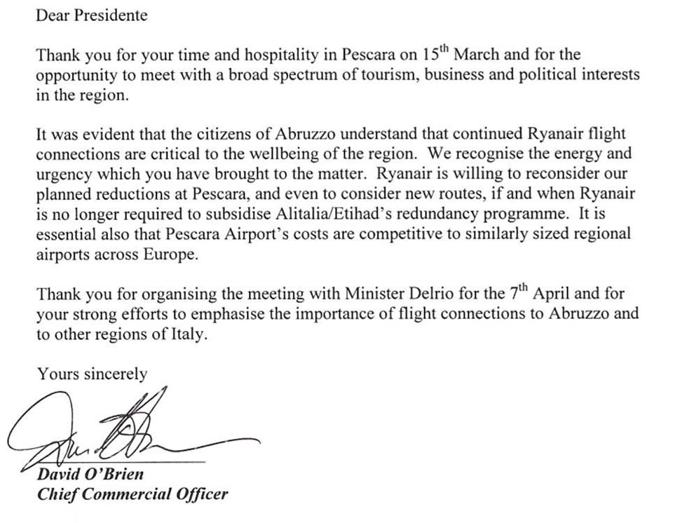 In una lettera inviata al presidente della Regione D’Alfonso, dopo l’incontro di martedì scorso a Pescara, Ryanair ribadisce che, se si cambia, è disposta a rivedere la decisione di lasciare l’aeroporto d’Abruzzo.