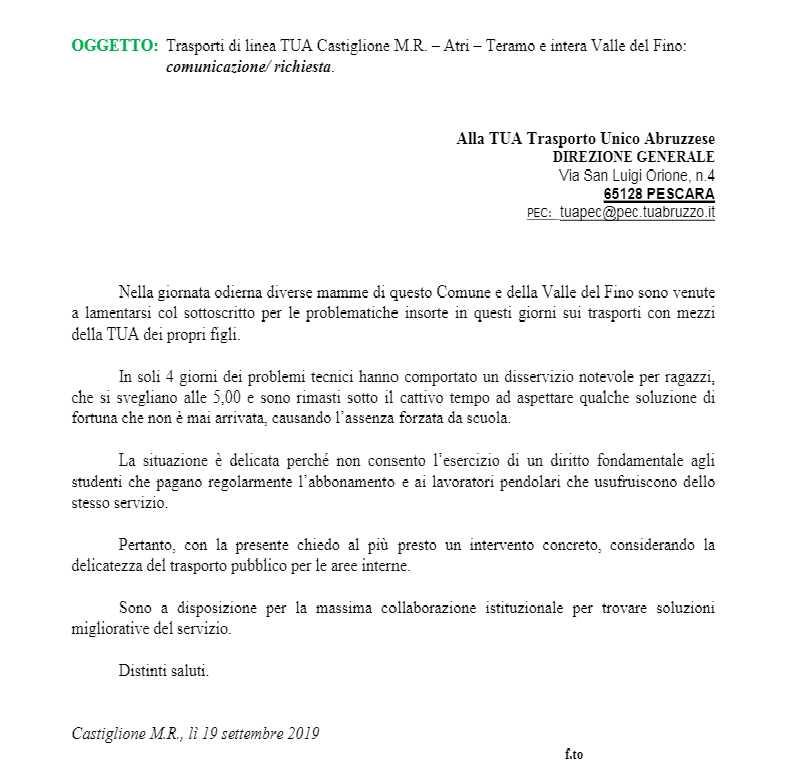 Esasperate da continui disservizi, le mamme degli studenti che frequentano gli istituti scolastici fuori dal loro Comune – per lo più Atri, ma non solo – si sono rivolte al sindaco di Castiglione Messer Raimondo, Vincenzo D’Ercole. Dal canto suo, il primo cittadino ha immediatamente scritto una lettera alla Tua: