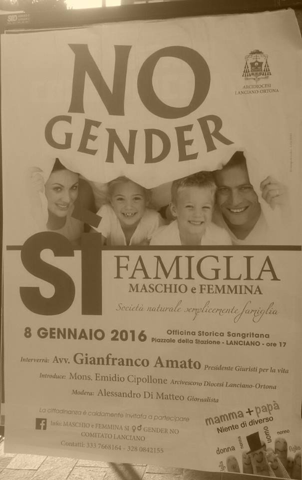 “A Lanciano da qualche giorno sono apparsi dei manifesti che annunciano un convegno, patrocinato peraltro dall’Arcidiocesi Lanciano-Ortona, organizzato dai cosiddetti “No gender”, spiega Adelio Iezzi dell’ Arcigay Chieti “Sylvia Rivera”. “L’ Arcigay Chieti intende richiamare l’attenzione della pubblica opinione sull’intento discriminatorio degli organizzatori che dietro una fantomatica e peraltro inesistente teoria del gender – va giù duro il comunicato di Adelio Iezzi – che secondo loro verrà presto introdotta nelle scuole, intendono opporsi a qualsiasi tipo di riconoscimento dei diritti civili di coppie omosessuali. Ebbene gli organizzatori del convegno, dietro un vagheggiato concetto primitivo di famiglia mirano ad impedire che a gruppi specifici di cittadini italiani venga riconosciuta la piena realizzazione come persone umane della propria condizione personale e sociale, come previsto dall’articolo 3 della Costituzione.”