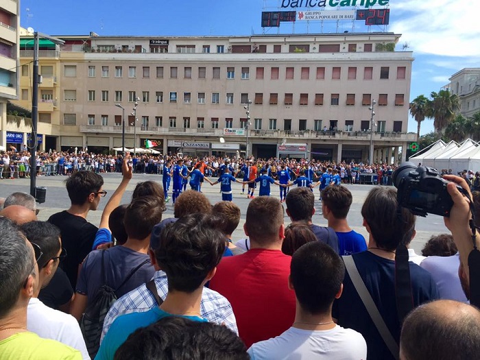 Un abbraccio caloroso per i ragazzi di Massimo Oddo che questa sera affronteranno nella finale di andata dei play-off promozione il Trapani dell’ex Serse Cosmi. Fra i più festeggiati all’arrivo in piazza, oltre ad Oddo, il capitano Ledian Memushaj, che giocherà il match di andata ma non quello di ritorno perché impegnato per gli Europei con l’Albania, e il bomber Gianluca Lapadula, capocannoniere del torneo di B con 29 reti, e nel mirino di numerose formazioni di serie superiore. Presente in piazza anche il sindaco di Pescara Marco Alessandrini. Così come l’anno scorso, anche questa volta il tecnico pescarese ha deciso di far disputare la rifinitura davanti ai propri supporters che questa sera (fischio d’inizio ore 20.30), gremiranno gli spalti dell’Adriatico dove troveranno posto 21mila spettatori. La finale di ritorno si disputerà giovedì 9 giugno, alla stessa ora al Provinciale di Trapani.