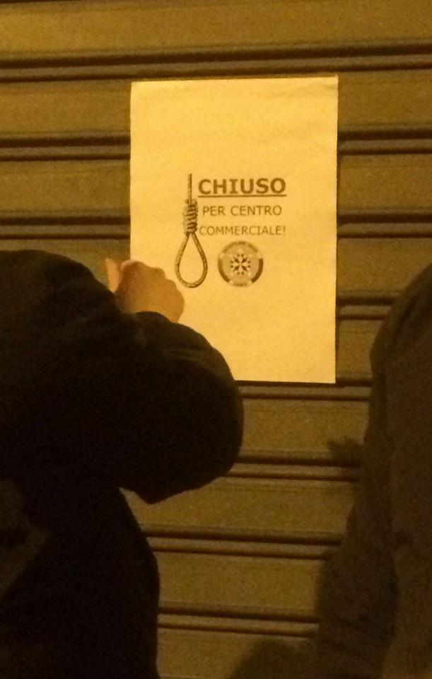 “Centro Commerciale cappio della nostra Città”, questo si legge sugli striscioni e sui volantini affissi nella notte da CasaPound Chieti, sulle saracinesche abbassate o chiuse dei negozi.