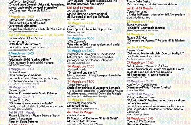 In programma, ancora, il concerto dei Gospel Sound Machine diretto da Paolo Zenni, la Festa dei Popoli grazie al contributo del Centro Servizi Volontariato – eventi legati alle tradizioni locali e religiose – la IX edizione della Festa del Majo, uno spettacolo del Gruppo Folkloristico Teatino, il concerto della Banda della Citta’ di Chieti, l’Infiorata del Corpus Domini, la Solenne Processione del Santo Patrono – manifestazioni sportive come il quinto Torneo di Calcio Balilla, “Pedalinstile” in abiti e bici d’epoca e il IV concorso di Eleganza della “Citta’ di Chieti”/mostra d’auto d’epoca; appuntamenti enogastronomici – Teate cake design e Marrucina Degusta con le ricette degli chef Santino e Luigi Strizzi – momenti culturali – mostra documentaria “1834-1934”, cent’anni di feste civili e religiose nel mese di Maggio in onore del Santo Patrono; mostra/tributo itinerante dedicata a Ivan Graziani; convegno sul Guerriero di Capestrano, presentazione del libro “Da Ercole a San Michele Arcangelo” – esibizioni nazionali cinofile e una sfilata evento.