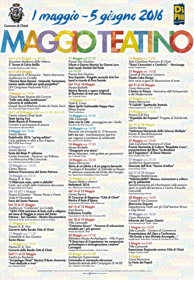 In programma, ancora, il concerto dei Gospel Sound Machine diretto da Paolo Zenni, la Festa dei Popoli grazie al contributo del Centro Servizi Volontariato – eventi legati alle tradizioni locali e religiose – la IX edizione della Festa del Majo, uno spettacolo del Gruppo Folkloristico Teatino, il concerto della Banda della Citta’ di Chieti, l’Infiorata del Corpus Domini, la Solenne Processione del Santo Patrono – manifestazioni sportive come il quinto Torneo di Calcio Balilla, “Pedalinstile” in abiti e bici d’epoca e il IV concorso di Eleganza della “Citta’ di Chieti”/mostra d’auto d’epoca; appuntamenti enogastronomici – Teate cake design e Marrucina Degusta con le ricette degli chef Santino e Luigi Strizzi – momenti culturali – mostra documentaria “1834-1934”, cent’anni di feste civili e religiose nel mese di Maggio in onore del Santo Patrono; mostra/tributo itinerante dedicata a Ivan Graziani; convegno sul Guerriero di Capestrano, presentazione del libro “Da Ercole a San Michele Arcangelo” – esibizioni nazionali cinofile e una sfilata evento.