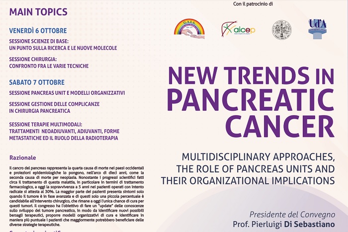 “New trends in pancreatic cancer: multidisciplinary approaches, the role of pancreas unit and their organizational implications” è il titolo del convegno che l’Auditorium del Rettorato dell’Università D’Annunzio di Chieti ospiterà venerdì 6 e sabato 7 ottobre.