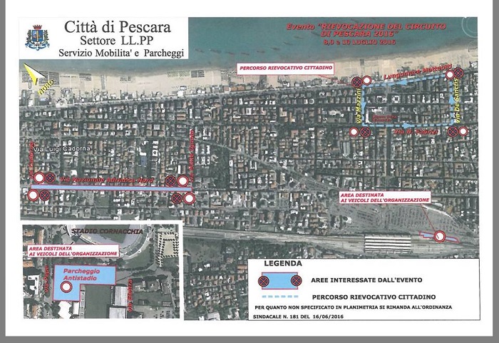 – dalle ore 15 alle 19 di sabato 9 luglio: l’istituzione del divieto di transito, di sosta con rimozione forzata (eccetto mezzi della manifestazione) nell’intera area a parcheggio del piazzale Antistadio; – dalle ore 6 alle ore 13 di domenica 10 luglio: e fino al termine della manifestazione: istituzione del divieto di transito e di sosta con rimozione forzata su Piazza Duca degli Abruzzi nonché sul tratto stradale di Viale Bovio/Via Nazionale Adriatica nord compreso tra l’incrocio con Via Tiepolo e l’intersezione con Via Milite Ignoto.