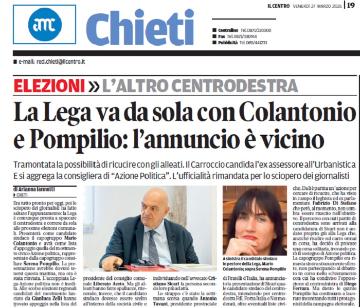 Secondo più che indiscrezioni, ora ci sono certezze: la Lega scende in campo con un proprio candidato, Mario Colantonio con Pompilio a sostegno. L’annuncio è vicino. Tramontata la possibilità di ricucire con gli alleati. Il Carroccio candida l’ex assessore all’urbanistica Mario Colantonio e si aggrega la consigliera di “Azione Politica”. L’ufficialità, scrive Arianna Iannotti su il Centro, è rimandata per lo sciopero dei giornalisti. Probabilmente la conferenza di presentazione ci sarà lunedì. Il percorso con cui i partiti di centrodestra sono arrivati alla candidatura di Sicari non è andata giù alla Lega che anziché salire sul carro in corsa, preferisce correre da sola trovando il sostegno di Azione Politica. Bocche cucite dal Carroccio. Mentre il centrosinistra unito aspetta l’ufficializzazione di Giovani Legnini, domani probabilmente ci sarà la conferenza stampa di fine mandato del sindaco Ferrara e la prossima settimana sarà decisiva per il quadro delle candidature. Come noto la Lega voleva puntare su un candidato politico mentre Fratelli d’Italia e Forza Italia propendevano per un candidato civico scelto nella figura di Sicari.