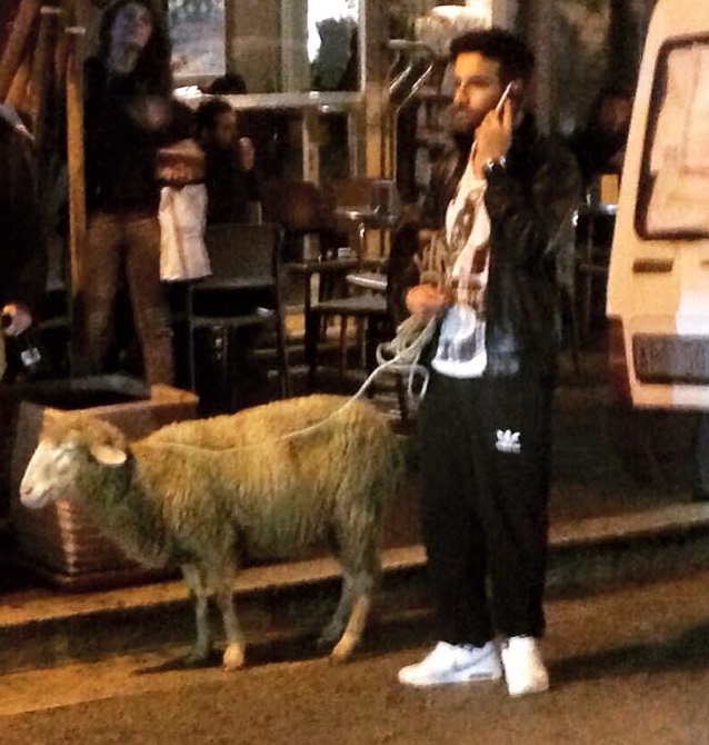 L’ultima trovata di Mario Ferri, noto come “Il Falco invasore”: a spasso per il centro di Cassino con una pecora al guinzaglio, per promuovere il suo ristorante da poco aperto.