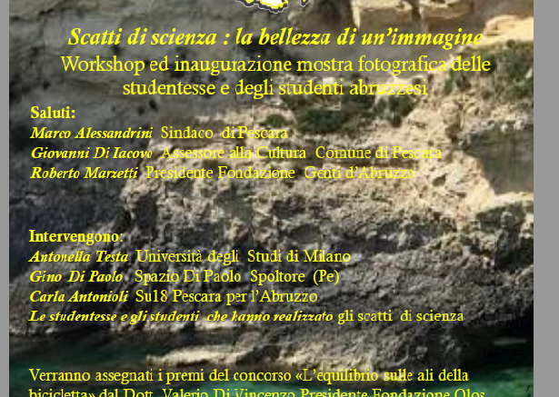 Il 28 maggio, in collaborazione con l’Università di Milano, il Museo delle Genti D’Abruzzo e l’assessorato alla Cultura del Comune di Pescara, saranno presentate le fotografie realizzate dai ragazzi per “Scatti di scienza”, accompagnate dalla scheda esplicativa. La giornata avrà inizio alle 9.30, a Pescara, negli spazi del Museo delle Genti.