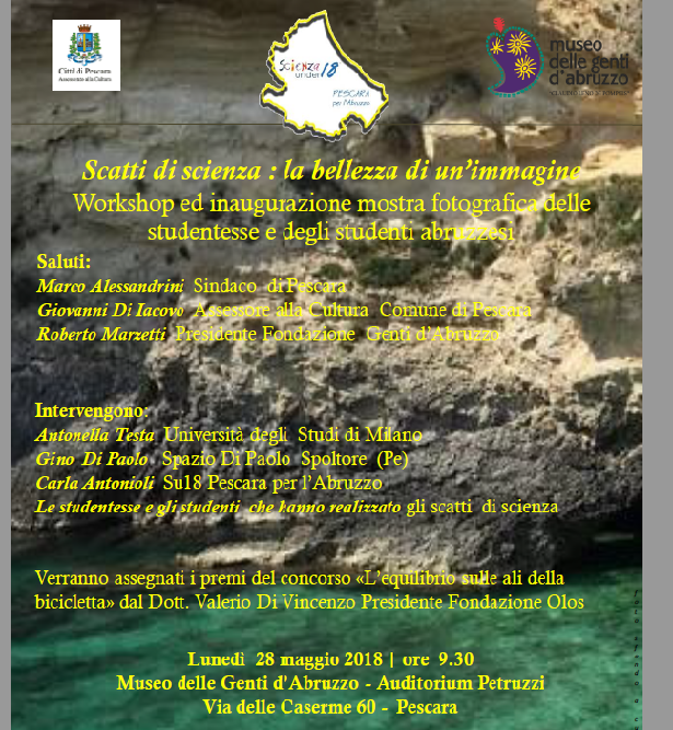 Il 28 maggio, in collaborazione con l’Università di Milano, il Museo delle Genti D’Abruzzo e l’assessorato alla Cultura del Comune di Pescara, saranno presentate le fotografie realizzate dai ragazzi per “Scatti di scienza”, accompagnate dalla scheda esplicativa. La giornata avrà inizio alle 9.30, a Pescara, negli spazi del Museo delle Genti.
