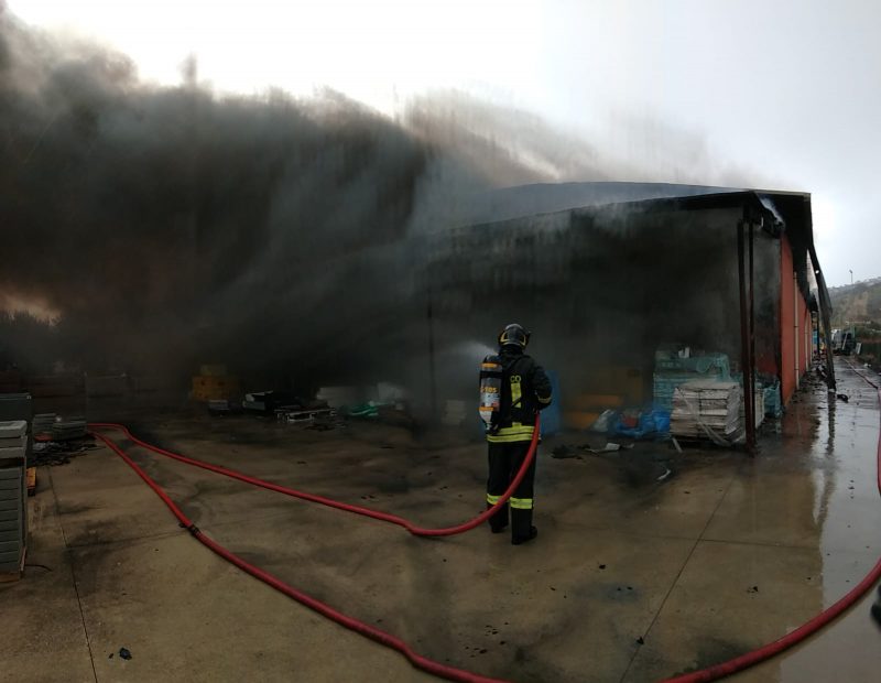 Due squadre dei Vigili del fuoco all’opera per spegnere un incendio divampato nel capannone della Edilizia Tommolini, nella zona di Martinsicuro. Si valuta il rischio ambientale.