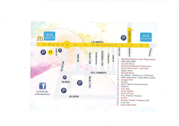 Su Corso Umberto e lungo viale Europa sarà possibile assistere alle esibizioni di: Montesilvano Cover Negramaro, Asd Igea 2000, Country Blues, Nicolino Di Battista fisarmoica, Cover Pink Floyd – Cold Play, Magic Show, Quartet Blues, Scuola di Ballo L. Mantini e A. D’Onofrio, ASD Lady Oscar/ ASD Ritmo Latino, Gruppo MP4, Centro Sportivo Karate Nicolosi, Trio Jazz, Cover Battisti, Ronny Circus, Stefano Camilli e Roberto Cilli, Ludo Bus, Cover Alex Britti. Nel corso della serata verranno organizzati anche spettacoli di cabaret, arte, poesia e dj set.