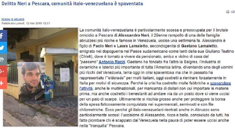 “La comunità italo-venezuelana è particolarmente scossa e preoccupata per il brutale omicidio a Pescara di Alessandro Neri, il 29enne rampollo di una delle famiglie abruzzesi più ricche e famose in Venezuela, ucciso una settimana fa. Alessandro è figlio di Paolo Neri e Laura Lamaletto, secondogenita di Gaetano Lamaletto, emigrato nel dopoguerra nel Paese sudamericano come tanti dalla sua Giuliano Teatino (Chieti), dove è tornato a vivere da pensionato, amico e vicino di casa del “paesano” Antonio Razzi”.
