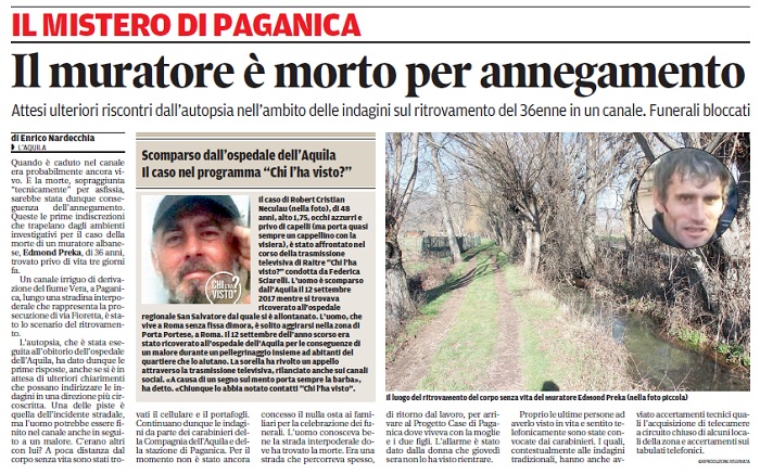 di via Fioretta. L’autopsia, che è stata eseguita all’obitorio dell’ospedale dell’Aquila, ha dato dunque le prime risposte, anche se si è in attesa di ulteriori chiarimenti da parte delle indagini dei Carabinieri dell’Aquila e di Paganica. Una delle piste seguite è quella dell’incidente o dell’omicidio stradale oppure un malore o un’aggressione. Ma ci si chiede se ci fossero altre persone con lui, a poca distanza dal corpo senza vita sono stati trovati il cellulare e il portafogli. Per il momento non è stato ancora concesso il nulla osta ai familiari per la celebrazione dei funerali. L’uomo conosceva bene quella strada che percorreva spesso per arrivare di ritorno dal lavoro al Progetto Case di Paganica dove viveva con la moglie e due figli. Proprio la moglie, che giovedì sera non lo ha visto rientrare, ha dato l’allarme. I Carabinieri hanno ascoltato le ultime persone ad averlo visto in vita o contattato telefonicamente. Al vaglio degli investigatori i tabulati telefonici e le videocamere di sorveglianza.