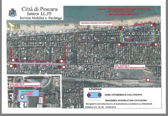 – Dalle ore 19 alle ore 24 di sabato 9 luglio e fino alla fine della manifestazione (previo accordo con gli organizzatori si è posticipato alle 19 l’inizio del divieto e non alle 16 come riportato nell’ordinanza allegata): divieto di transito, sosta e fermata con rimozione sulle seguenti strade cittadine: Via Nicola Fabrizi (fino all’intersezione con Via Francesco De Sanctis), Via Francesco De Sanctis, Lungomare Matteotti e Viale Riviera Nord (dal Largo Mediterraneo all’intersezione con Via Giuseppe Mazzini), Via Giuseppe Mazzini (tratto all’intersezione con Via Riviera Nord fino all’intersezione con Via Regina Margherita), Via Regina Margherita (nel tratto Via Mazzini – Piazza della Rinascita)