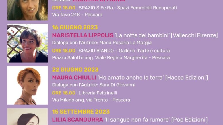 Ad ospitare i volumi di Monia e un ciclo di incontri letterari sarà lo Spazio S.FE.RA. (Spazi Femminili RecuperAti) in via Tavo 248. L’inaugurazione della Libreria di Monia è stato il primo di quattro appuntamenti: il 16 e il 22 giugno e il 15 settembre, quando si terranno le presentazioni dei libri di tre scrittrici abruzzesi, rispettivamente Maristella Lippolis, Maura Chiulli e Lilia Scandurra.