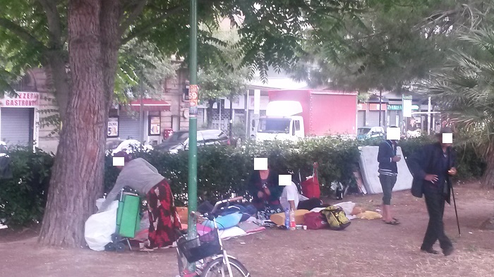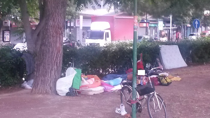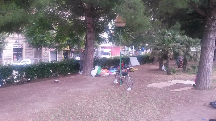 Stamattina, di buon ora, ci siamo recati nella zona e abbiamo realizzato filmati e scattato foto che raccontano ciò che accade ogni giorno: queste persone si alzano, cercano di pulire alla meno peggio ciò che hanno lasciato dalla sera prima, poi vanno via e vi tornano solo per dormire, la sera. Accanto a queste storie di disperazione e degrado, però, c’è anche la solidarietà: un gruppo di volontari del Centro Cristiano Evangelico della Chiesa rumena, ogni mattina, si reca sul prato-dormitorio del terminal bus per portare caffè, cornetti, un po’ di umanità, qualche parola di conforto. Ci spiegano, questi volontari, che se nell’area in questione, su materassi di fortuna e cartoni sono accampati soprattutto Rumeni di origine rom, già qualche centinaio di metri più in là, nei pressi della stazione centrale però, ci sono anche italiani, soprattutto quelli a cui manca una manciata di anni per andare in pensione e dunque, al momento, non ne hanno diritto. Per questo si ritrovano a vivere nei tunnel della stazione, o nelle zone limitrofe. Chiediamo agli stessi volontari del perché queste persone preferiscano sopravvivere così piuttosto che tornare in Romania, ci rispondono che lì da loro avevano paura di morire, che le condizioni di vita, erano ben peggiori. Poi ci spiegano che nei dormitori cittadini i posti sono limitati, per questo bisogna fare una turnazione e che grazie alle mense, come quelle della Caritas e di San Francesco, almeno un pasto per loro è garantito.