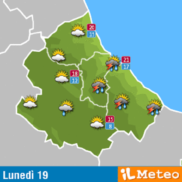 Nel Pescarese: temporali e schiarite, temperature tra i 17 e i 21 gradi.