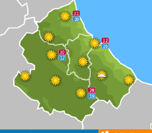 Nel Teramano: Vento da Est con intensità di 10 km/h. Raffiche fino a 15 km/h. Temperature minime comprese tra 19 e 25 °C e massime comprese tra 29 e 35 °C.