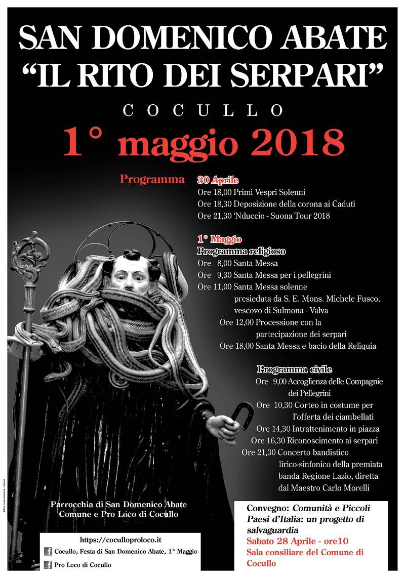 Si attende il riconoscimento della festa dei Serpari come Bene immateriale dell’Unesco. Le celebrazioni si apriranno con la santa Messa. Poco dopo mezzogiorno il santo uscirà dalla chiesa e sarà circondato dai serpari che porranno le serpi (bisce innocue) intorno alla testa e al busto della statua. Le serpi vengono catturate da mani esperte, per una tradizione che si tramanda di padre in figlio, almeno un mese prima della festa. I serpenti, di specie non velenose, vengono custodite in cassette di legno. Accanto alla statua del santo due ragazze con abiti tradizionali portano sulla testa un cesto con cinque pani sacri chiamati “ciambellani” in memoria di un miracolo. Tradizione vuole che le serpi sulla statua di San Domenico non debbano coprire gli occhi, premonizione di sventure. I serpenti, specificano gli organizzatori, verranno poi riportati nei luoghi dai quali sono stati presi. Un modo, questo, per esorcizzare la paura in un animale da sempre considerato come simbolo del male. Sono tanti, infatti, che scoprono la docilità di queste serpi e le mettono addosso, le accarezzano e superano un luogo comune.